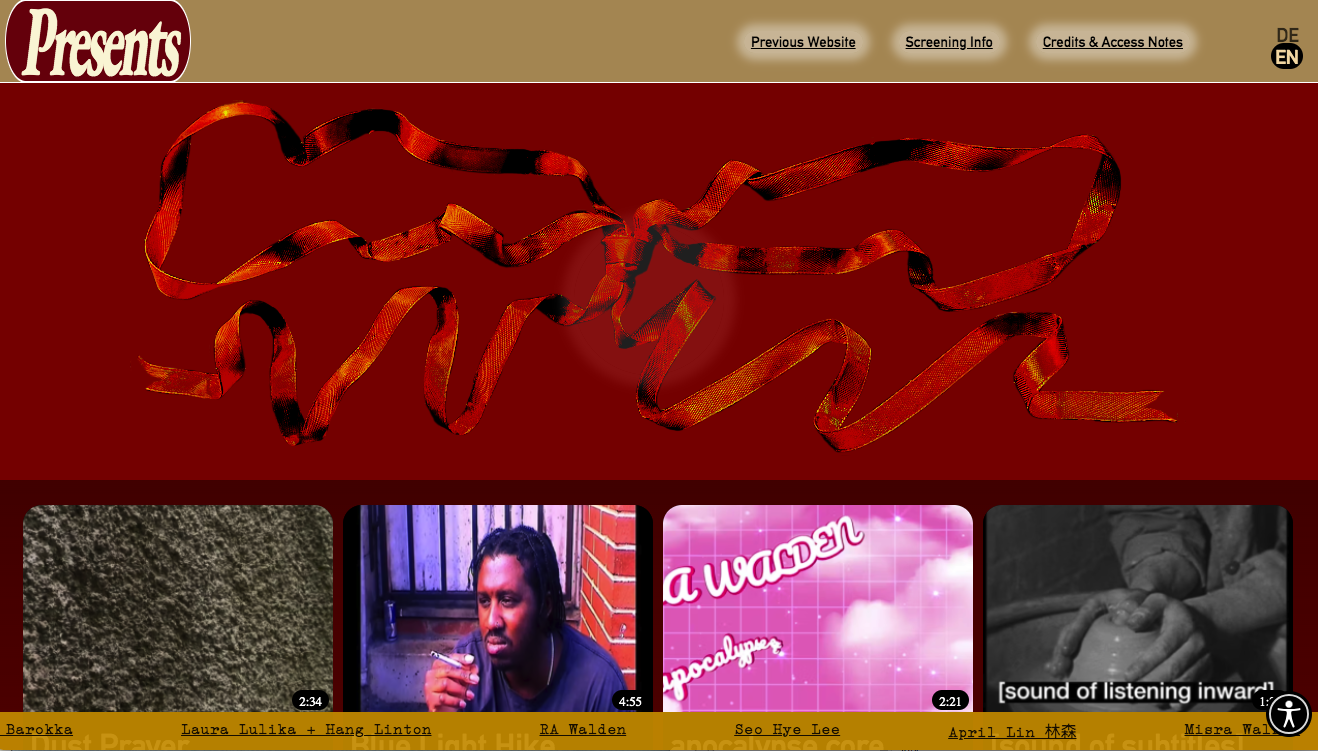 A site to host 11 works curated by Frances Breden and RA Walden. The site presents these videos as gifts, and allows users to view the content in German and English and has as Audio Described and ALS/DGS versions of each video.